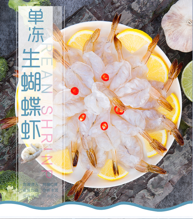 本产品选用北部湾海域捕捞的鲜活白对虾为原料,运用专业冷链物流运输设备,把白对虾迅速地运送到洁净的生产车间内,专业处理去头去壳,去除虾线保留虾尾,再沿虾体中部将虾肉剖开,切割过程中不损害虾体天然肉质纤维,最终使虾肉整体呈蝴蝶状。在高端流水生产线进行生产加工下,蝴蝶虾肉能在新鲜状态下成为速冻产品,最大限度地保存了蝴蝶虾肉的鲜美品质。产品包装美观实用,分量充足,食用方便,虾肉外形精致,口味鲜甜清新,可用于烹制黄金蝴蝶虾、翡翠蝴蝶虾等日常家庭菜肴或各式餐饮场合。